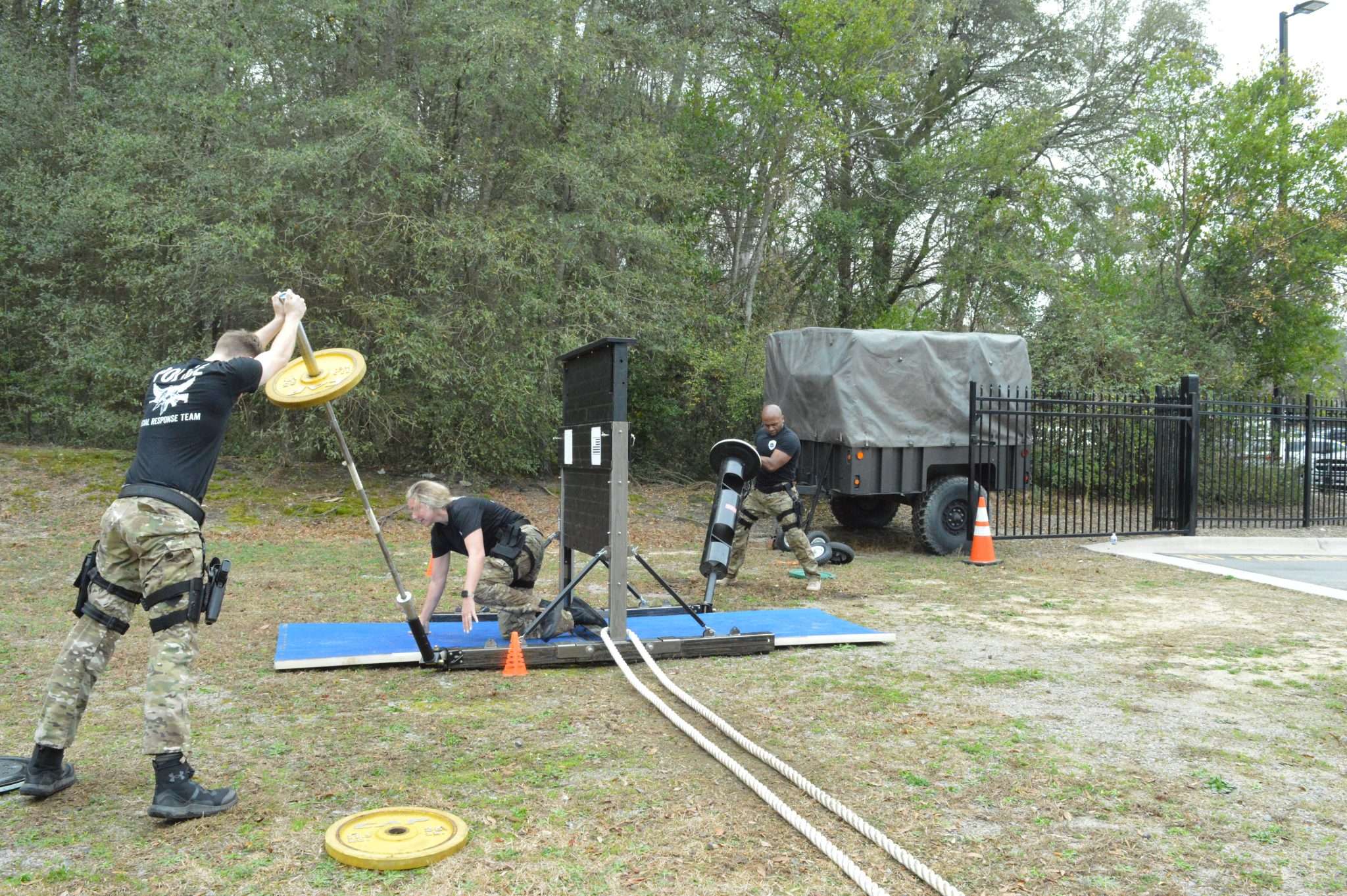 - For the first time ever First Responders and Military can have a mobile gym that can be used by up to 10 people at once, perform traditional fitness exercises as well as mimic actual on the job proficiencies. It can be used indoors or outdoors, then folds up and rolls away. Now municipalities can have a state of the art fitness training facility without the cost and burden of construction and permanent structures.